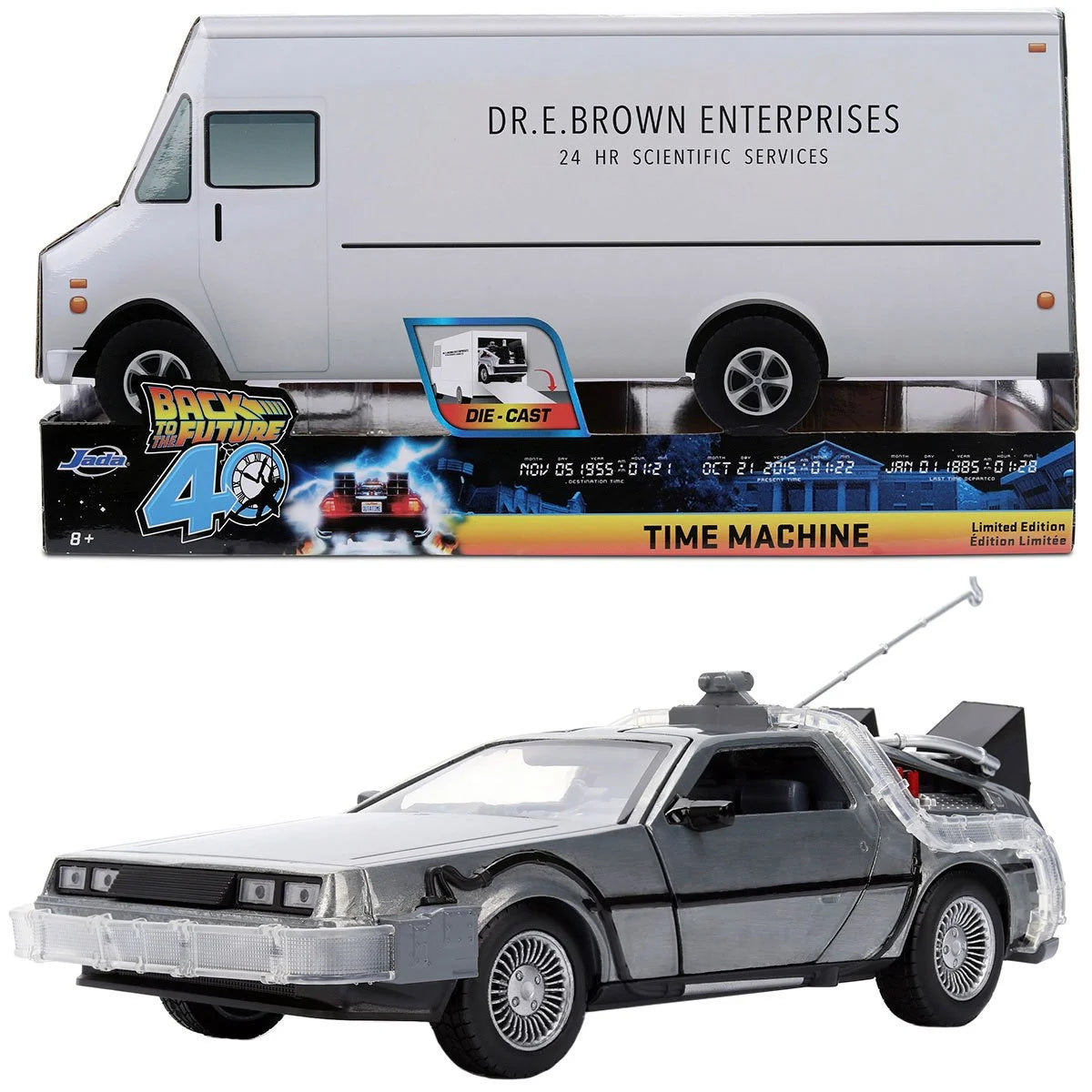 Step into cinematic history with the Back to the Future 40th Anniversary Time Machine by Jada Toys. This 1:24 scale die-cast vehicle captures the legendary Time Machine in brushed silver styling, reflecting its look from the original film. With precision detailing, rolling wheels, and opening features, it's built to be displayed, admired, or gently played with. What sets this edition apart is its packaging-styled as Dr. E. Brown's "24 HR Scientific Services" truck. While not a separate toy, the truck-shaped display box recreates the unforgettable scene where the Time Machine makes its dramatic debut. A must-have for collectors and fans-secure this limited edition Hollywood Rides Back to the Future Time Machine 40th Anniversary 1:24 Scale Die-Cast Metal Vehicle before it vanishes! Ages 8 and up